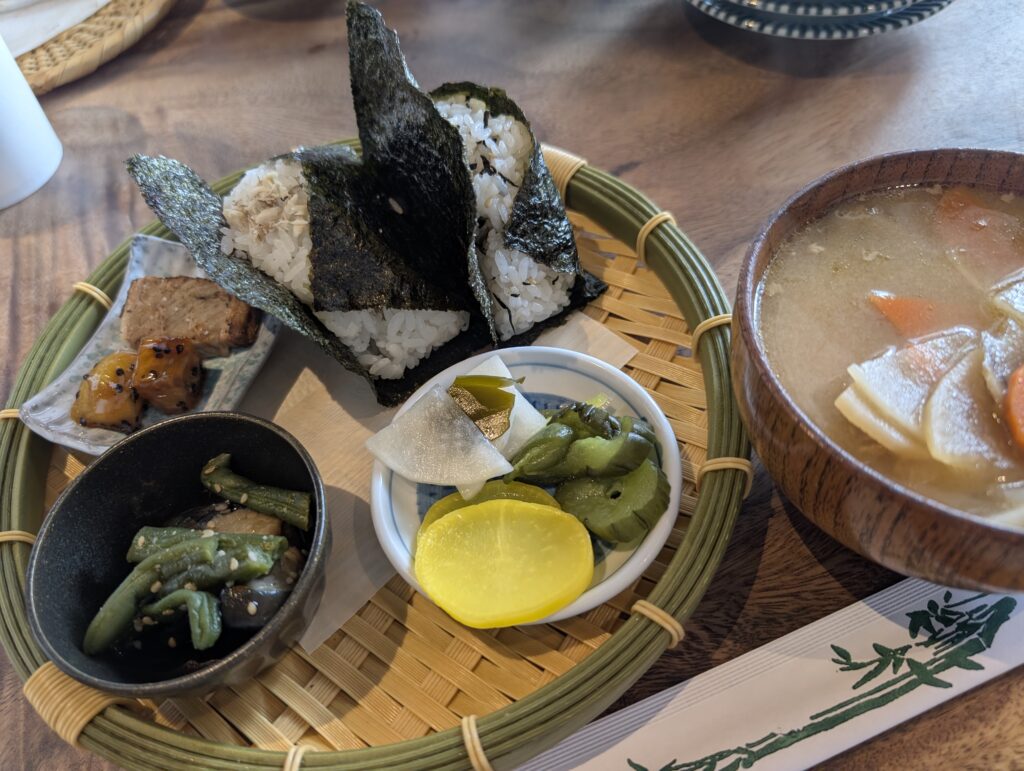 お店は、ワイキキから車で約10分ほどのサウスキング通り沿いにあります。おむすびをモチーフにした暖簾や、ライトアップされた看板がとても印象的で、外観だけを見ると一見おむすび専門店とは思えないほどスタイリッシュです。ちょっと遅い朝ごはんにと、平日の10時頃に訪れましたが、なんと満席!ローカルの人達でにぎわっておりました。